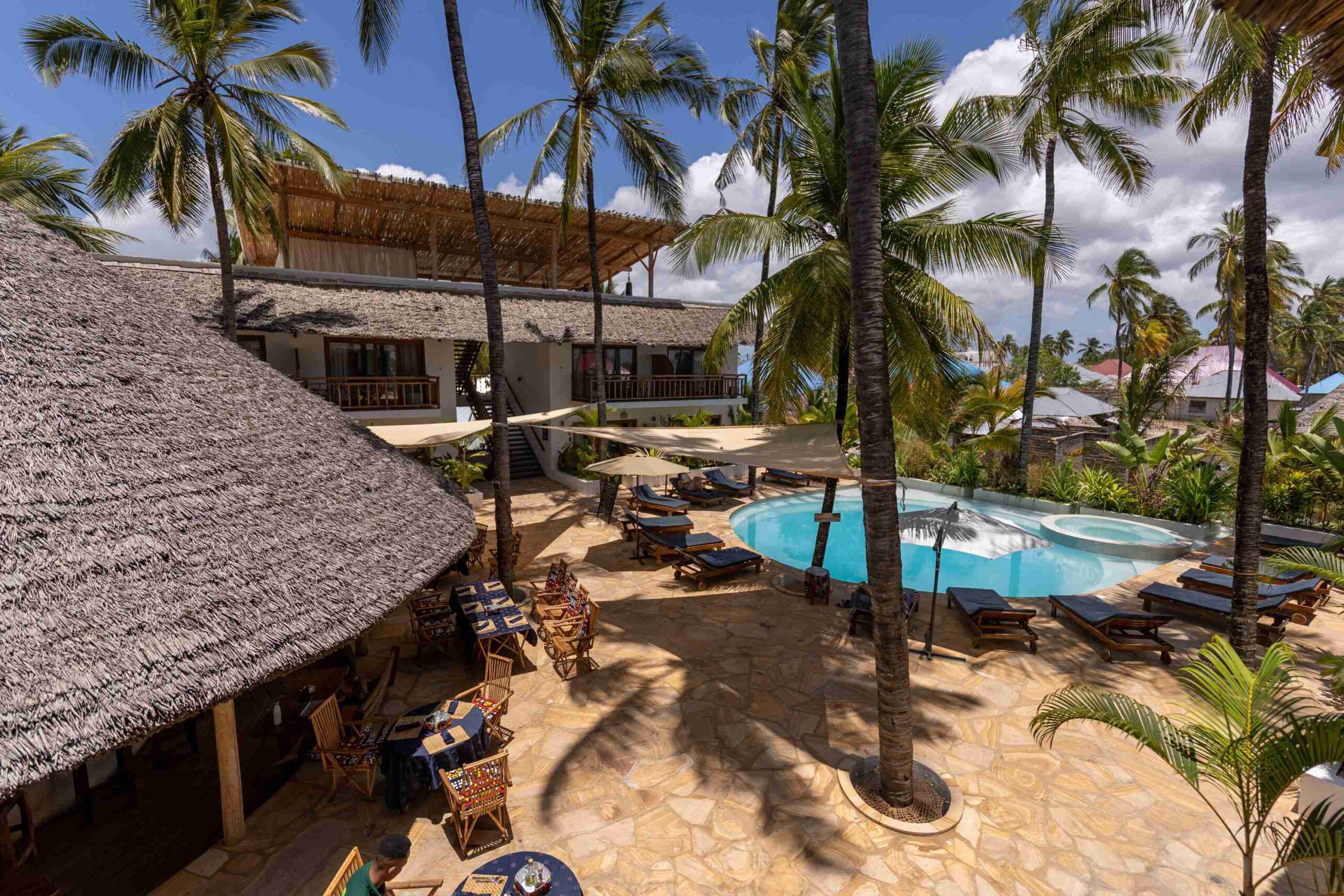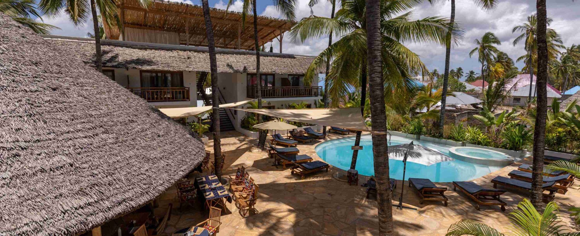 Aluna Paje is een hotel middenin het levendige centrum van Paje, aan de oostkust van Zanzibar. Verspreid over meerdere gebouwen van twee verdiepingen vind je hier fijne kamers in nautische sferen rondom een zwembad. Kamers zijn mooi ingericht in hout en wit met kleurrijke details, door de combinatie van meubels van gebruikt dhow hout, en hergebruikte materialen zoals melkverpakkingen en Afrikaanse stofjes voor decoraties. Enorme palmbomen zorgen voor schaduw rondom het zwembad, waar ligbedden en cocktails op gasten wachten terwijl chefkoks in het restaurant heerlijke verse maaltijden bereiden. Tot slot is er een dakterras met uitzicht over de oceaan en het dorp, wat het tot de perfecte hangplek maakt bij de zonsondergang ieder avond.