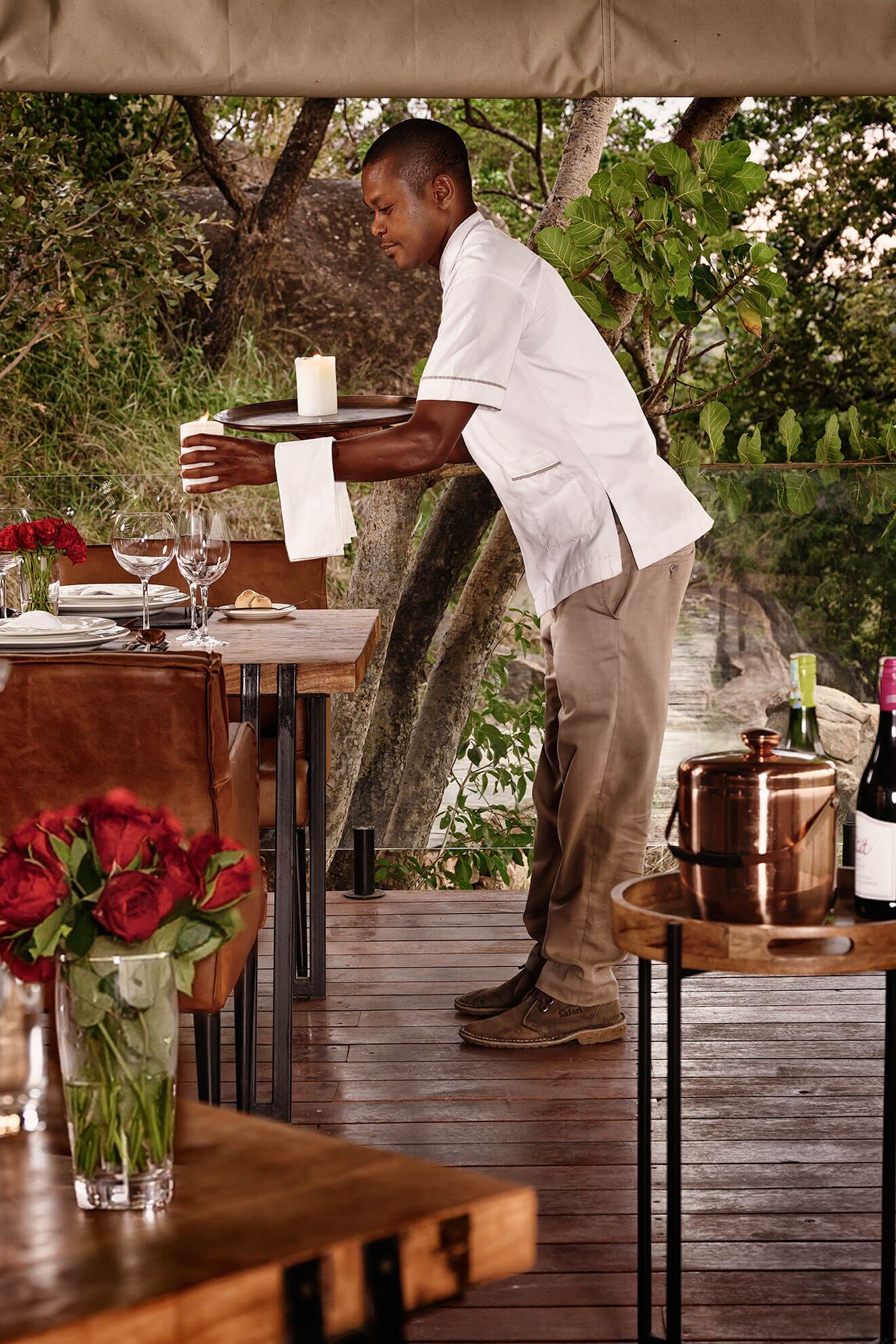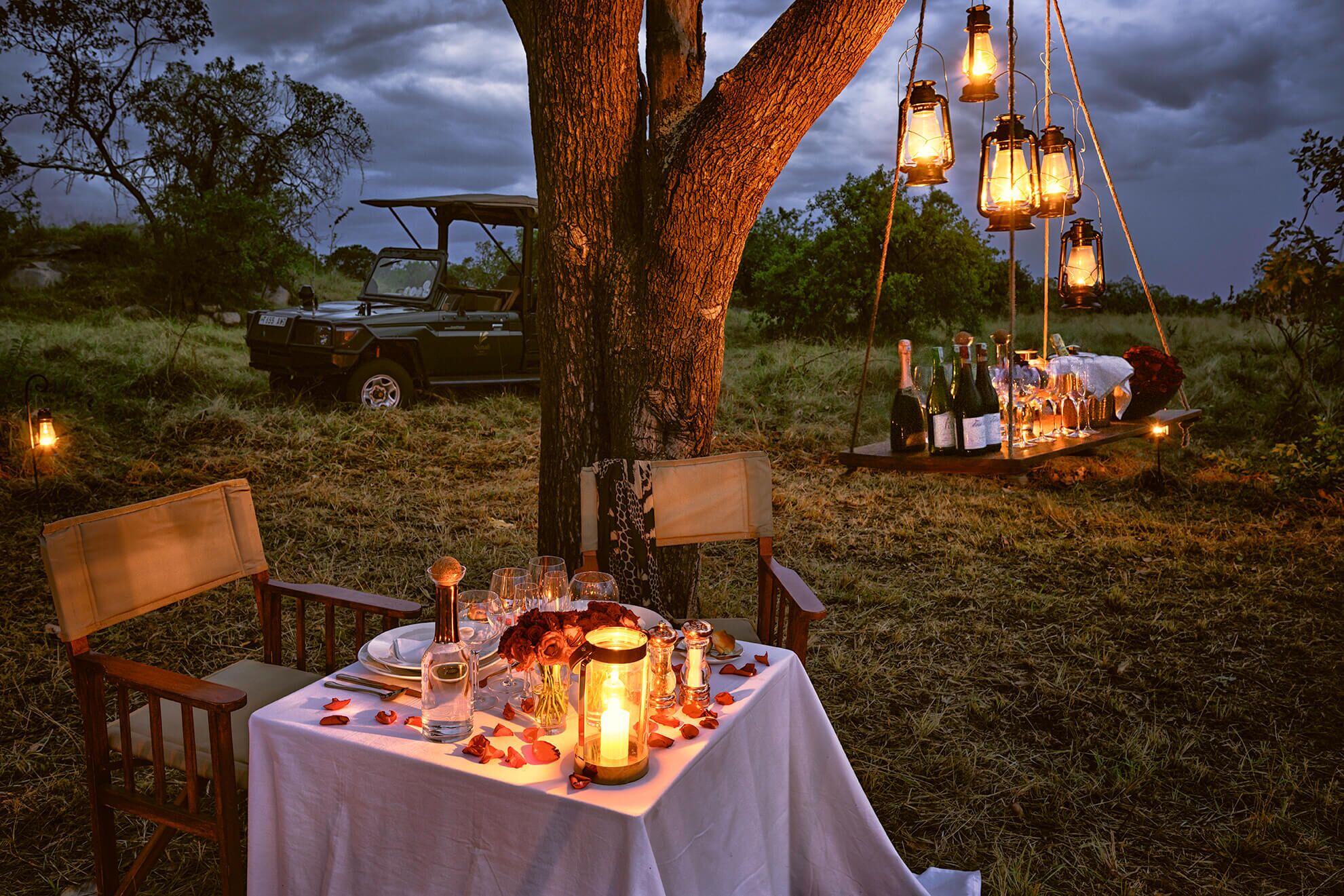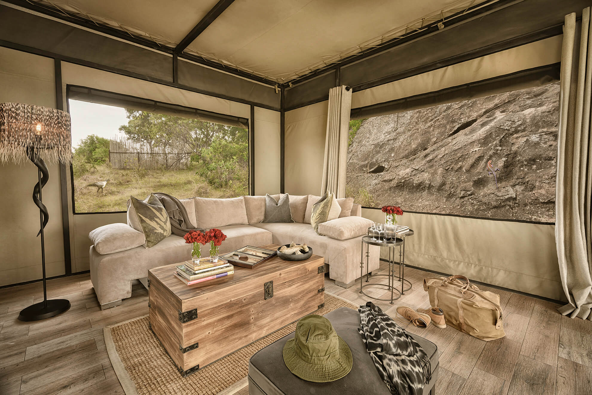 Alles is er hier op gericht om het uitzicht op de regelmatig voorbijtrekkende kuddes gnoes en zebra’s te perfectioneren. In een rots is een overloopzwembad uitgehakt waar je heerlijk van een cocktail kunt genieten terwijl je kijkt naar de dieren die voorbij trekken. En in de tenten zelf heb je overal een prachtig uitzicht: vanuit het grote bed, vanaf het schommelbed op het terras en vanuit de koperen badkuip die strategisch voor de openslaande glazen ramen is geplaatst. Bovendien zijn er twee familie- annex bruidstenten met een eigen dompelbad… dat natuurlijk ook een prachtig uitzicht heeft. Overbodig te zeggen dat het eten hier heerlijk is en de service onberispelijk. Een unieke plek voor een nog lang te heugen safari-avontuur!
