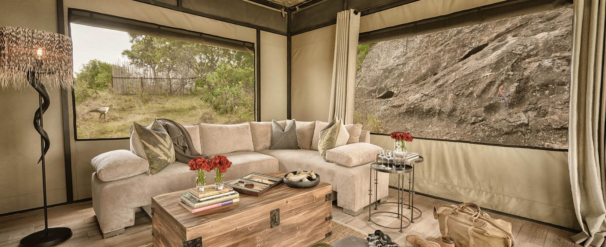 Alles is er hier op gericht om het uitzicht op de regelmatig voorbijtrekkende kuddes gnoes en zebra’s te perfectioneren. In een rots is een overloopzwembad uitgehakt waar je heerlijk van een cocktail kunt genieten terwijl je kijkt naar de dieren die voorbij trekken. En in de tenten zelf heb je overal een prachtig uitzicht: vanuit het grote bed, vanaf het schommelbed op het terras en vanuit de koperen badkuip die strategisch voor de openslaande glazen ramen is geplaatst. Bovendien zijn er twee familie- annex bruidstenten met een eigen dompelbad… dat natuurlijk ook een prachtig uitzicht heeft. Overbodig te zeggen dat het eten hier heerlijk is en de service onberispelijk. Een unieke plek voor een nog lang te heugen safari-avontuur!
