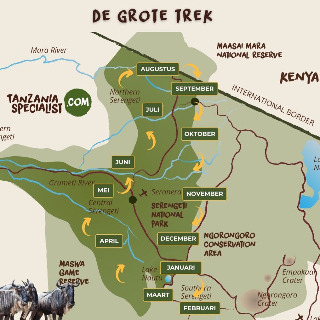 | Oktober tot november | De trek naar het zuiden | Masai Mara en de noordelijke tot de zuidelijke Serengeti |