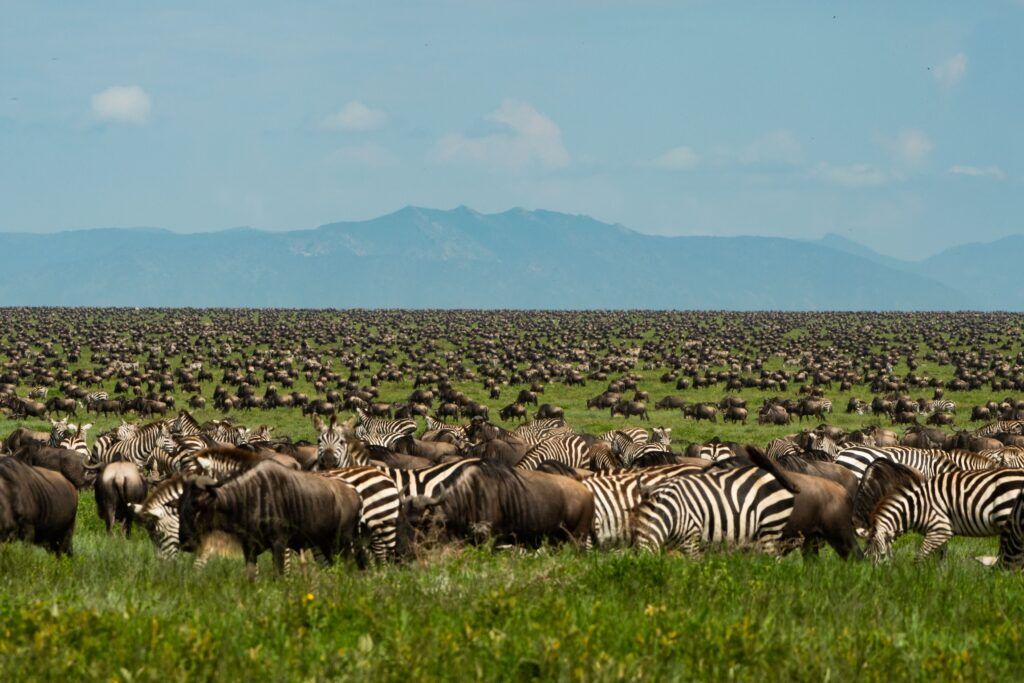 In de Serengeti zijn de dieren vrij om te gaan waar ze willen. Het is echt een prachtig gezicht om bijna twee miljoen gnoes en zebra’s te zien. Verspreid over de vlaktes van Tanzania genieten ze van vers en voedzaam gras.